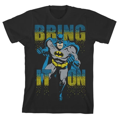 - GRAPHIC DESIGN: This shirt features the classic Batman running straight toward the viewer, flanked by the words “BRING IT ON” in blue and yellow lettering.