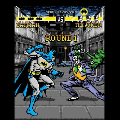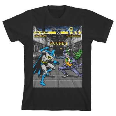 - GRAPHIC TEE: Batman and the Joker enter the world of videogames on this graphic tee. The two fight each other on a city street while yellow bars above display their health. Bring this tee home to your young gamer today.