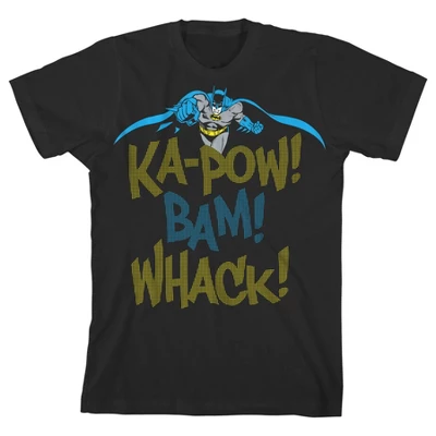 - GRAPHIC TEE: This boy’s tee features yellow and blue checkered words with multiple exclamation points that read, “Ka-pow, Bam, Whack.” Batman can be seen at the top readying his fists for combat while his cape billows in the wind.