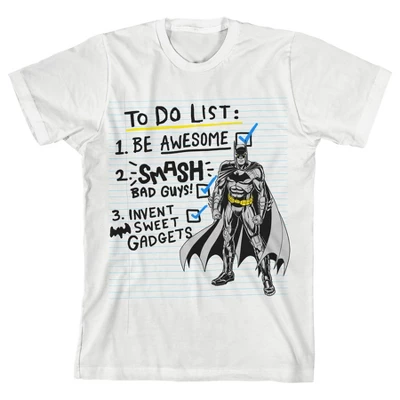- GRAPHIC TEE: Batman stands next to his to-do list on this tee. His list of things to do includes, “be awesome, smash bad guys, and invent sweet gadgets. Fans of the superhero will love this fun design.