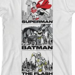 - CUSTOM DESIGN: Line art images of Superman, Batman, and the Flash in front of city backgrounds decorate this graphic tee while black letters below the images spell out each superhero’s name. Justice League fans will love this fun design.
